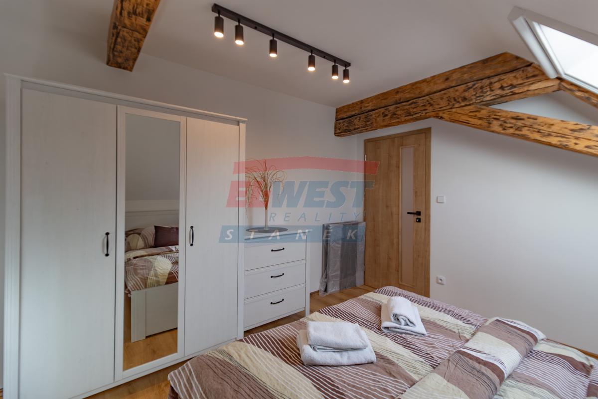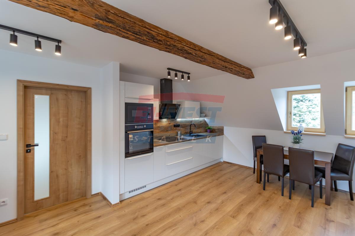 Apartmán č. 2. o podlahové ploše 48,3 m2 je kompletně moderně a vkusně vybavený jak elektrospotřebiči, tak nábytkem. Vnitřní dispozice 2+kk v 1. NP: vstupní předsíň, kuchyňský kout - kuchyňská linka zn. Oresi ( s el. horkovzdušnou troubou s indukční deskou, mikrovlnnou troubou, lednicí s mrazákem zn. Mora). Jídelní koutek s obývacím prostorem včetně nábytku a TV ; ložnice. Koupelna (se sprchovým koutem, umyvadlem, topným žebříkem a připojením k pračce, baterie – Grohe, sanita - Geberit), samostatné WC. V rámci rekonstrukce bylo provedeno zaizolování stropů, položeny protihlukové podlahy, plovoucí podlaha zn. Quick – Step a protihlukové stěny mezi apartmány, okna dřevěná s trojskly. Vytápění je řešeno klimatizací Haier - ovládanou tel., vjezdová brána ovládaná tel. a kódovým systémem, samostatné připojení wifi, kamerový systém. K bytu náleží vlastní venkovní prostor k posezením, kój (5m2), jedno parkovací stání u domu a společné venkovní prostory k odpočinku. Voda čerpána z vrtané studny, odpad řešen ČOV. V rezidenci je dále k dispozici využití sauny a fitness.