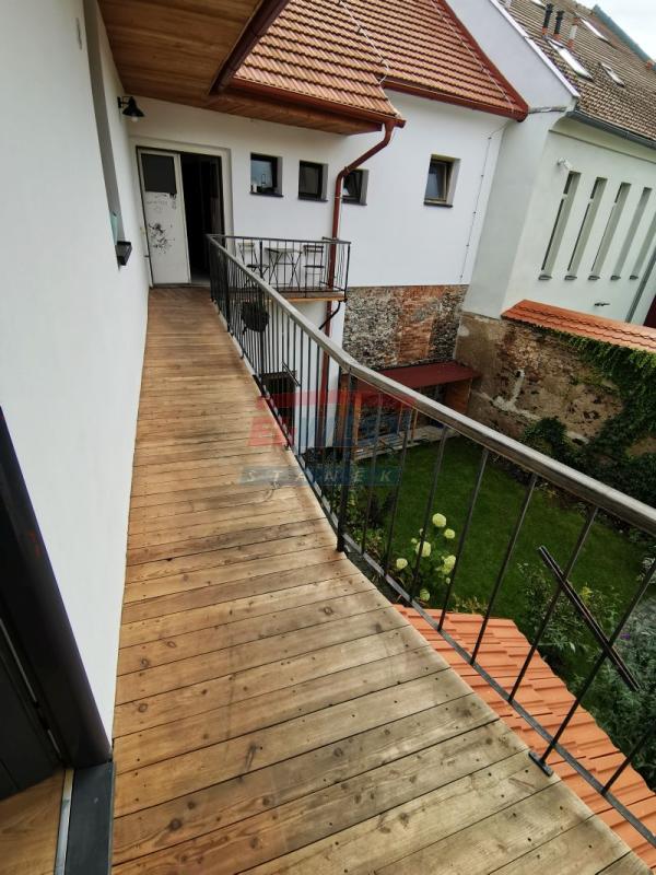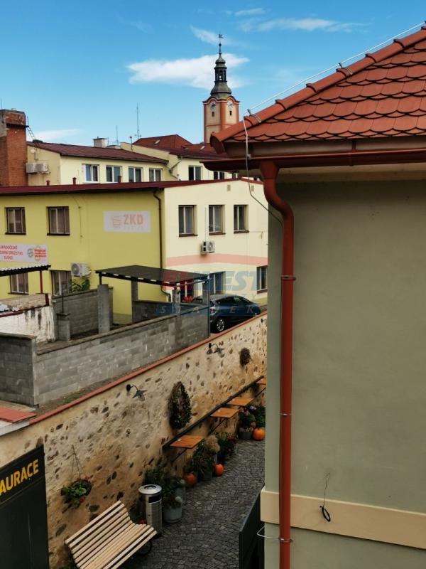 Byt s východní orientací disponuje prostorným obývacím pokojem propojený s kuchyňským koutem. Kuchyňská linka s kameninovým dřezem včetně vestavěných spotřebičů: trouba se sklokermickou varnou deskou se dvěma plotýnkami, digestoř, myčka, pračka a vestavná menší lednička. Dále samostatná ložnice a předsíň. Moderní koupelna se sprchovým koutem, umyvadlem, elektrickým bojlerem, keramickou dlažbou a obklady. Nášlapné vrstvy podlah pokojů jsou plovoucí /laminátové/, dveře původní repasované. Stylová dřevěná okna STANDARD TERMO IV 84 s izolačním trojsklem, které zajišťují odhlučnění a minimální propustnost tepla. Vytápění: sálavé elektrické nástěnné konvektory, ohřev vody boilerem. Přístup k bytu je přes sdílenou pavlač, kterou je možné využívat k posezení. Měsíční platby: 9.000,-Kč + 800,-Kč- /1 os. zálohy na služby ( spotřeba vody, úklid společných prostor, el. společných prostor, správa) + zálohy na el. energii (cca 5.000,-Kč/měs.), které se přepisují na nájemce. Vratná kauce 27.000,-Kč. V těsné blízkosti najdete obchody a služby, ve městě veškerá občanská vybavenost. Velmi vkusný byt připravený k okamžitému užívání k 1.2.2026.